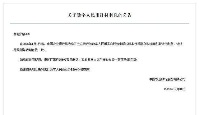 2025年12月31日,工商银行、农业银行、中国银行、建设银行、交通银行、邮储银行集体发布关于数字人民币重磅公告。公告称,自2026年1月1日(含)起,将为客户开立在该行的数字人民币实名钱包余额,按照活期存款挂牌利率计付利息,计结息规则与活期存款一致。